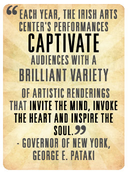 | Irish Arts Center programs are supported, in part, by government partners including the New York State Council on the Arts with the support of Governor Andrew Cuomo and the New York State Legislature; public funds from the New York City Department of Cultural Affairs, in partnership with the City Council; Culture Ireland, the agency for the promotion of Irish arts worldwide; the Department of Foreign Affairs and the Consulate of Ireland in New York; the Northern Ireland Bureau; British Council Northern Ireland; the Arts Council of Northern Ireland; The American Ireland Fund; Howard Gilman Foundation; Tourism Ireland; Bloomberg Philanthropies; and thousands of generous donors like you. | ||